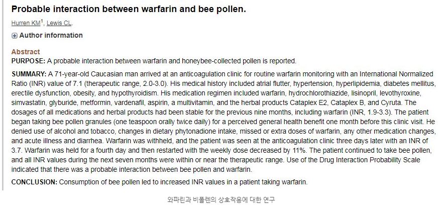 혈전약 중 와파린과 같은 항혈액응고제 복용시 상호작용으로 인한 부작용이 발생할 수 잇습니다.