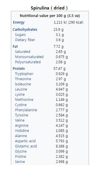 스피루리나는 100g당 열량이 약 290칼로리 정도인데 가장 많은 비중을 차지하고 있는 것은 단백질로 60%에 육박할정도입니다.